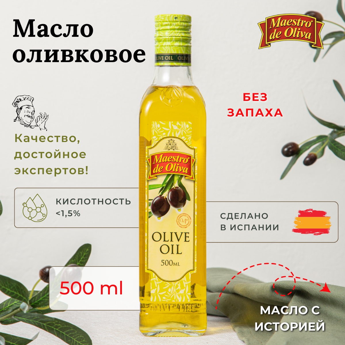 Масло оливковое Maestro De Oliva стеклянная бутылка, 0.5 л