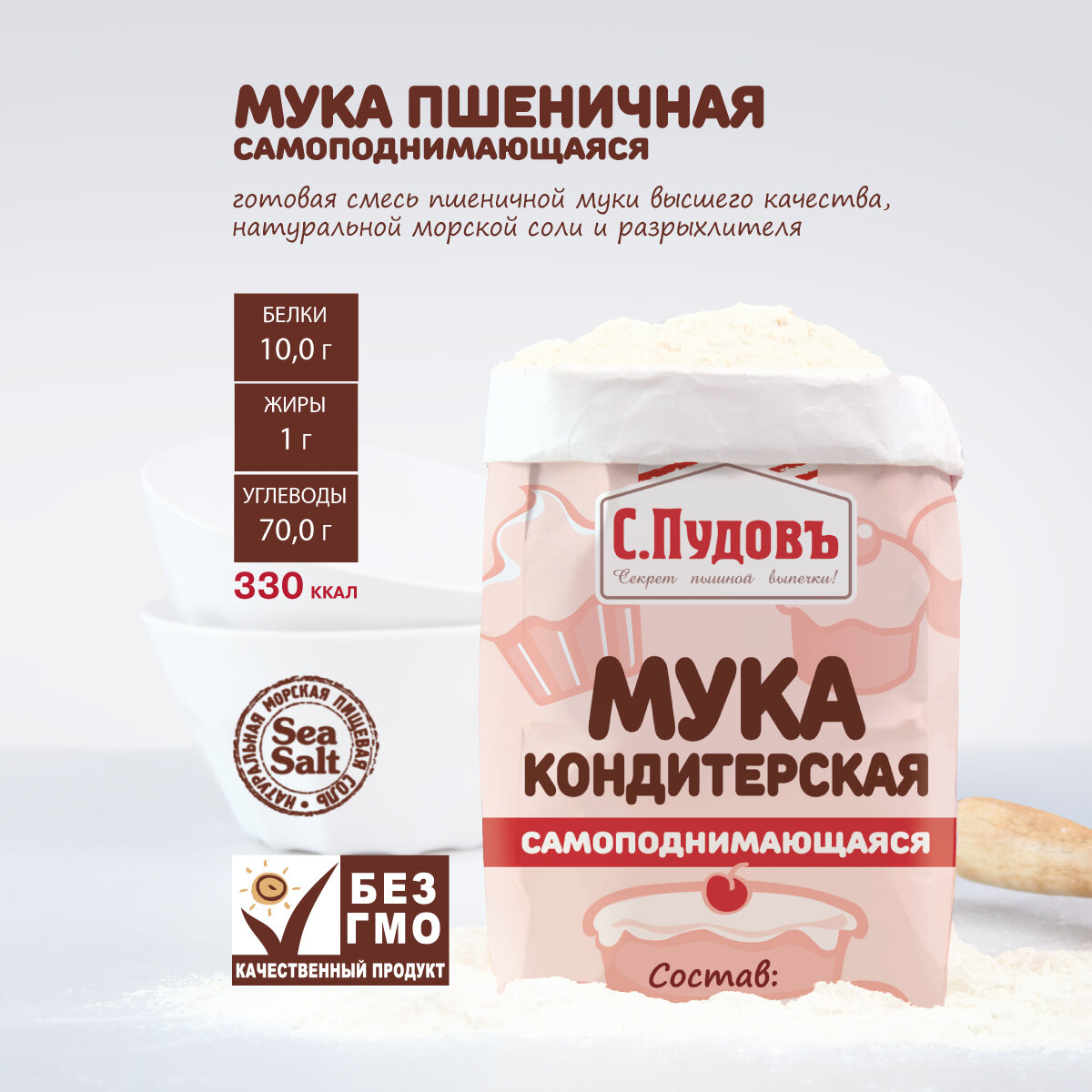 Мука кондитерская самоподнимающаяся пшеничная хлебопекарная высший сорт С. Пудовъ, 2 кг