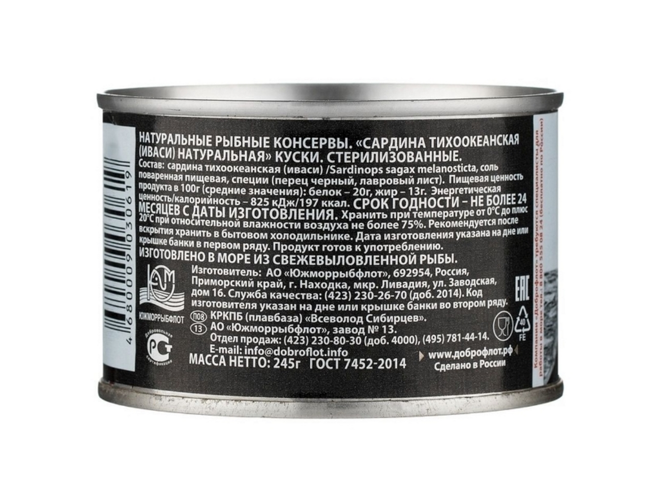 Сардина доброфлот тихоокеанская "" (иваси) натуральная 245 г