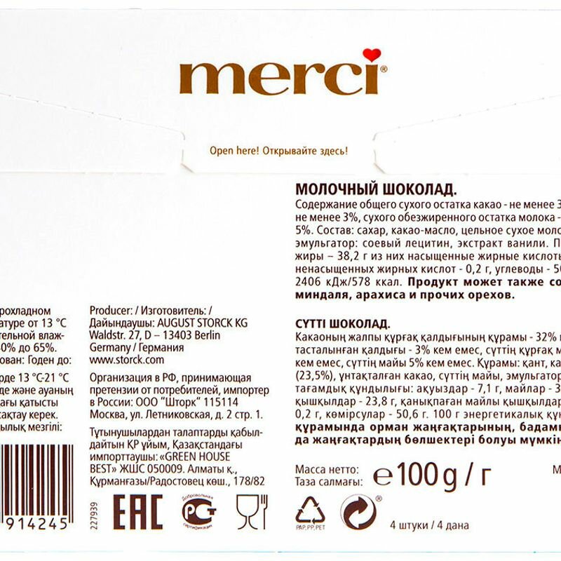 Merci, шоколад молочный, шоколадные плитки 100г. Мерси, произведено в Германии