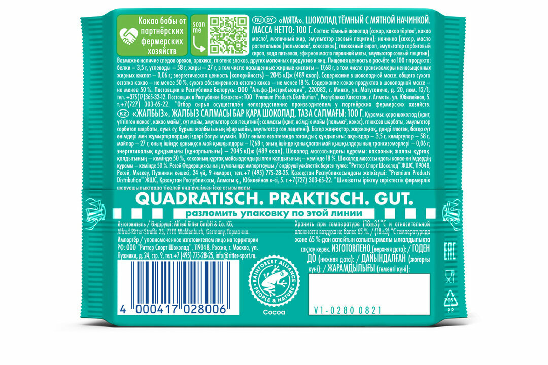 СохранитьШоколад Ritter Sport темный с начинкой мята 100г Германия интересное: