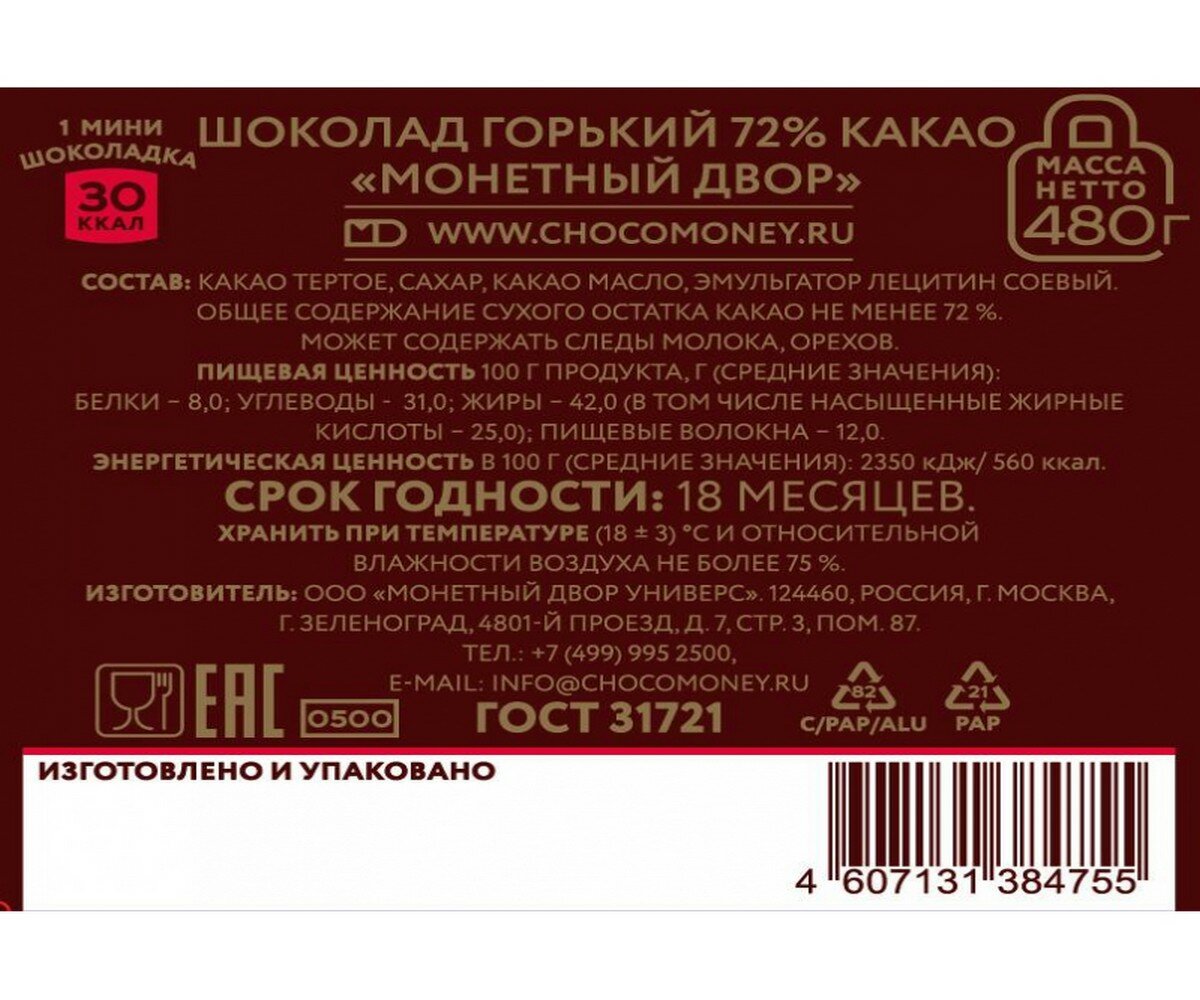 Шоколад Монетный двор Горький 72% 5г/96 шт интересное: