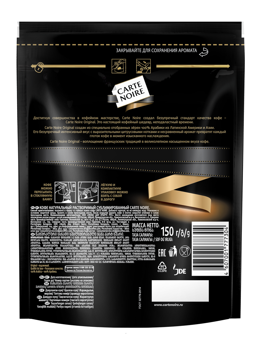 Кофе растворимый Carte Noire "Original", сублимированный, мягкая упаковка, 150г