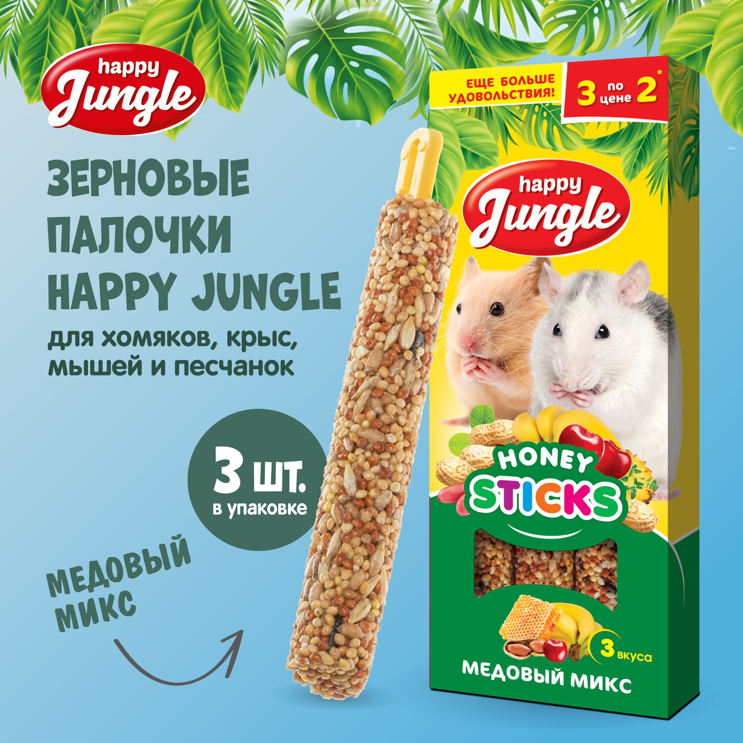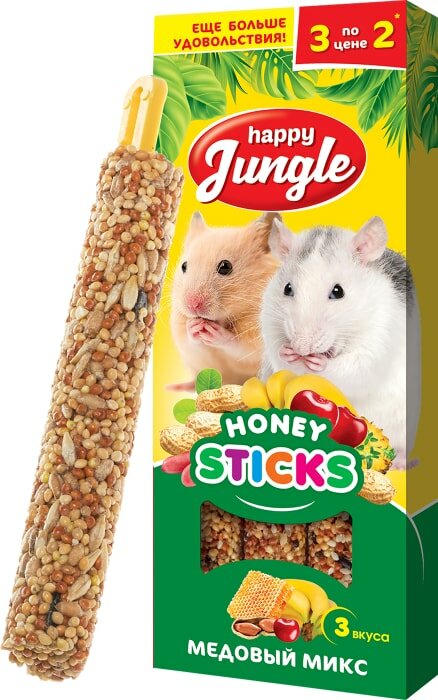 Лакомство для грызунов Happy Jungle / Хэппи Джангл Палочки медовый микс 90г, в упаковке 3шт. / корм для животных