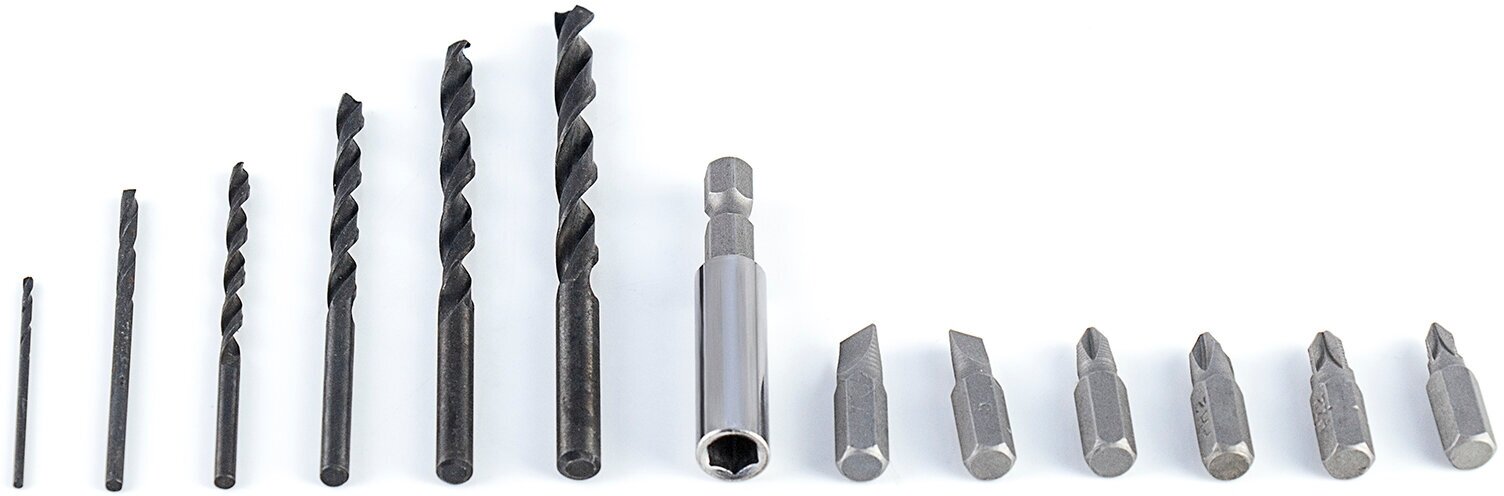 | Плюсы: | работает, сверла и биты в наборе, кейс |