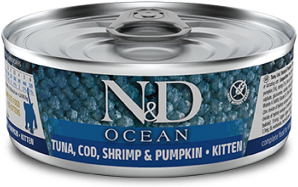 FARMINA CAT N&D OCEAN TUNA, COD, SHRIMPS & PUMPKIN KITTEN беззерновые для котят с тунцом, треской, креветками и тыквой (80 гр х 12 шт)
