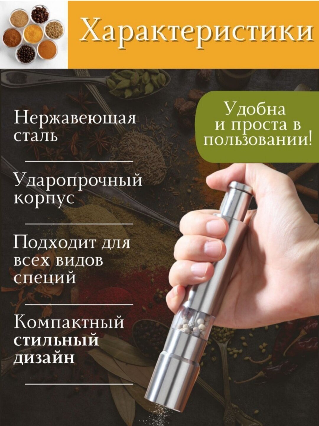 Мельница для специй , нержавеющая сталь,для ручного помола