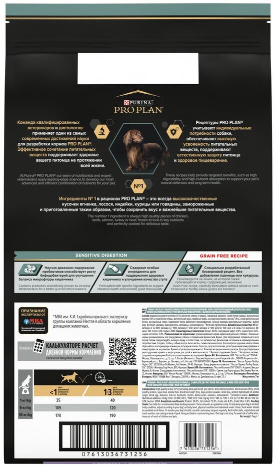 Pro Plan корм для взрослых собак малых пород, беззерновой, чувствительное пищеварение, индейка 7 кг