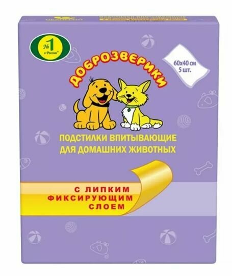 Доброзверики Подстилки впитывающие для домашних животных, одноразовые, с липким фиксирующим слоем, 5 шт/уп, 60 х 40 см
