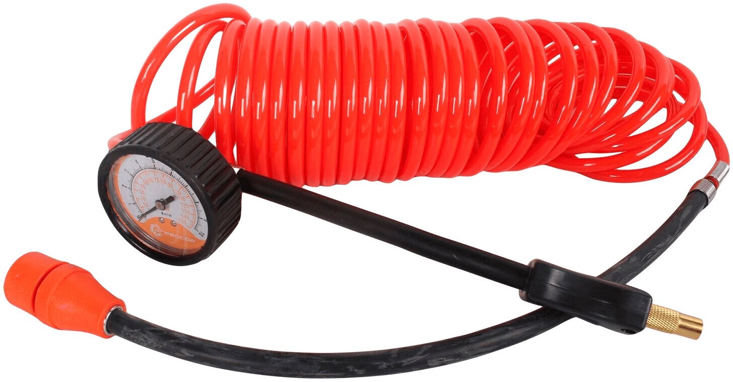 Длинный шланг и время работы позволяет один раз подключить компрессор и без лишних движений накачать все колёса. Манометр достаточно точный (сзади кнопка для сброса давления в шланге чтобы посмотреть сколько уже накачано) |