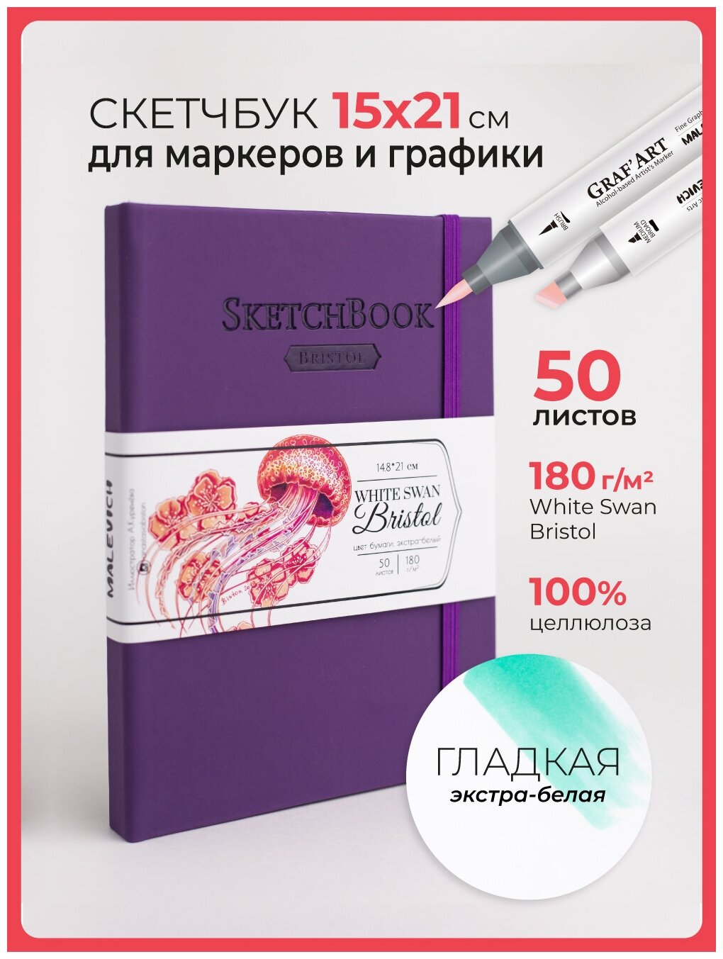 Малевичъ Скетчбук для графики и маркеров "White Swan Bristol", малиновый, 180 г/м, А5 см, 50л
