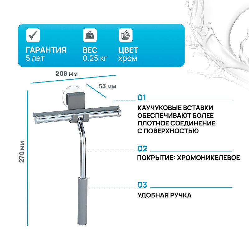 | Минусы: | Недостаточно качественно собирает воду со стекла в ванной |