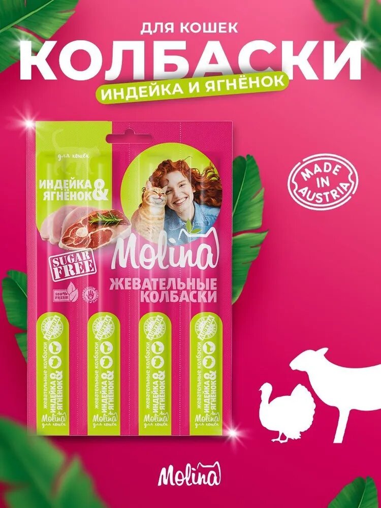 Купить Лакомство для кошек Молина Жевательные колбаски Индейка и ягненок, 5г х 4шт. в уп. 20 г