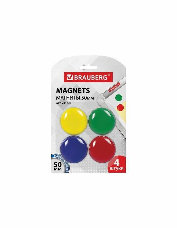 Магниты большого диаметра, 50 мм, комплект 4 штуки, цвет ассорти, в блистере, BRAUBERG, 231736 В наборе: 1компл.