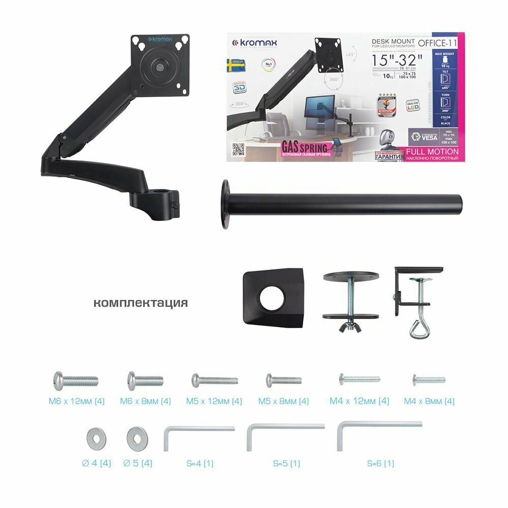 Настольное наклонно-поворотное крепление Kromax OFFICE-11 для LCD/LED монитора 15-32 VESA 75/100 max 10кг черный