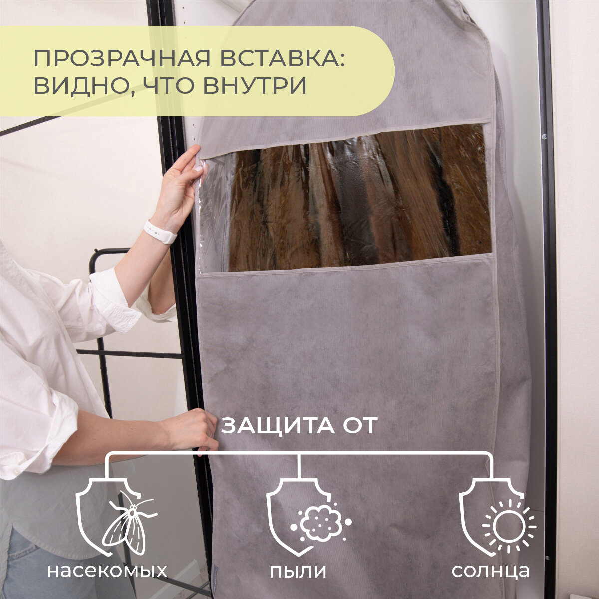 | Плюсы: | Чехол хороший, дышащий. Покупала для шубы 60 размера, длиной до середины икры при росте 163. Чехол подошёл в самый раз |