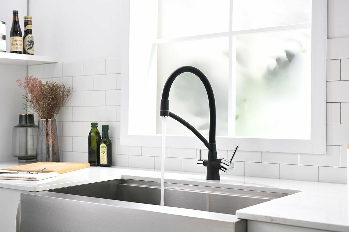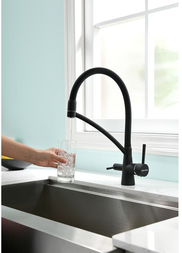 Смеситель для кухни с гибким изливом Paulmark SIEGEN, подключение к фильтру питьевой воды, двурычажный, поворотный, латунь / силикон, на мойку / столешницу, черный, Si213111-308