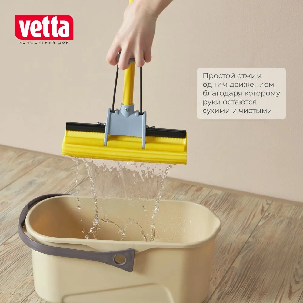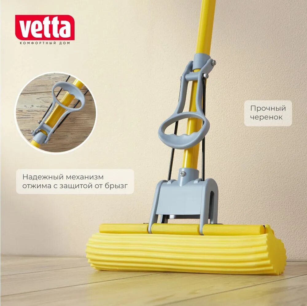 Швабра для мытья полов с отжимом Vetta, с насадкой ПВА, телескопическая ручка 120 см, 1 ряд роликов