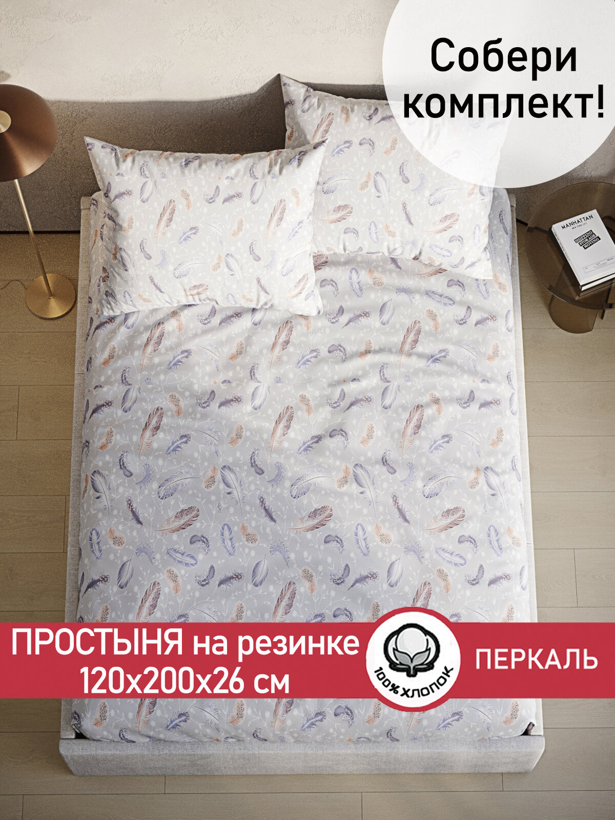 Простынь на резинке Сказка "Перышко" 180х200 см, ткань перкаль, 100% хлопок, высота 26 см