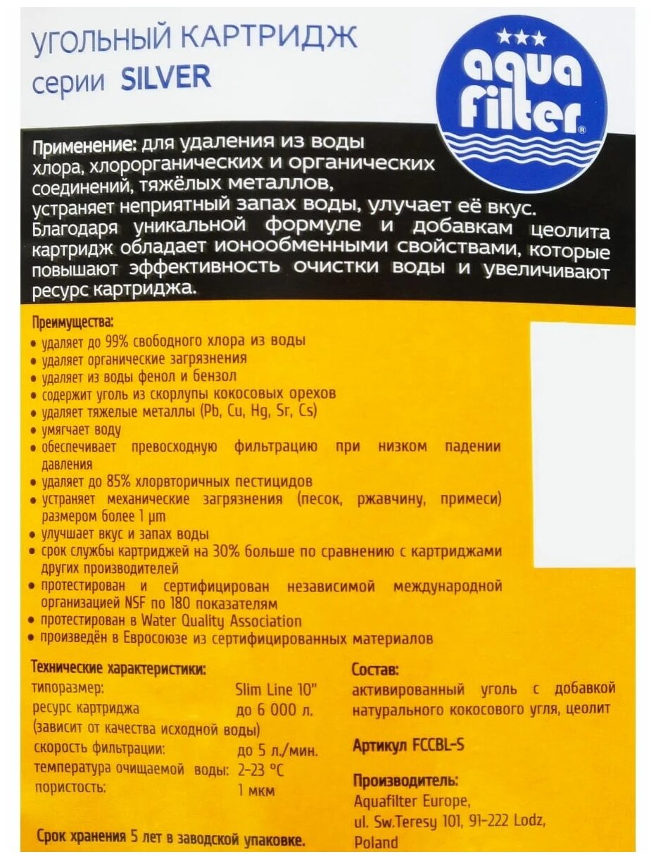 Ниже Вы можете прочитать отзывы на Aquafilter FCCBL-S, 10SL Картридж серии SILVER из спечённого активированного угля и цеолита, ознакомится с подробными характеристиками, посмотреть интересные обзоры и фотографии на Aquafilter FCCBL-S, 10SL Картридж серии SILVER из спечённого активированного угля и цеолита.