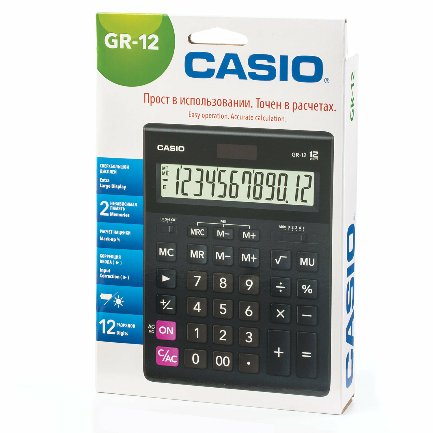 Калькулятор настольный CASIO GR-12-W (209х155 мм), 12 разрядов, двойное питание, черный, европодвес, GR-12-W-EP
