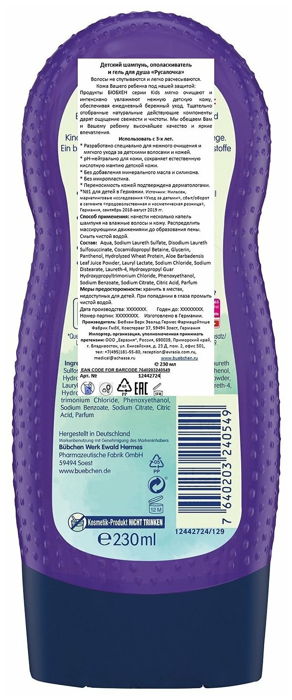 Bubchen Детский шампунь, ополаскиватель и гель для душа 3 в 1 «Русалочка», 230 мл