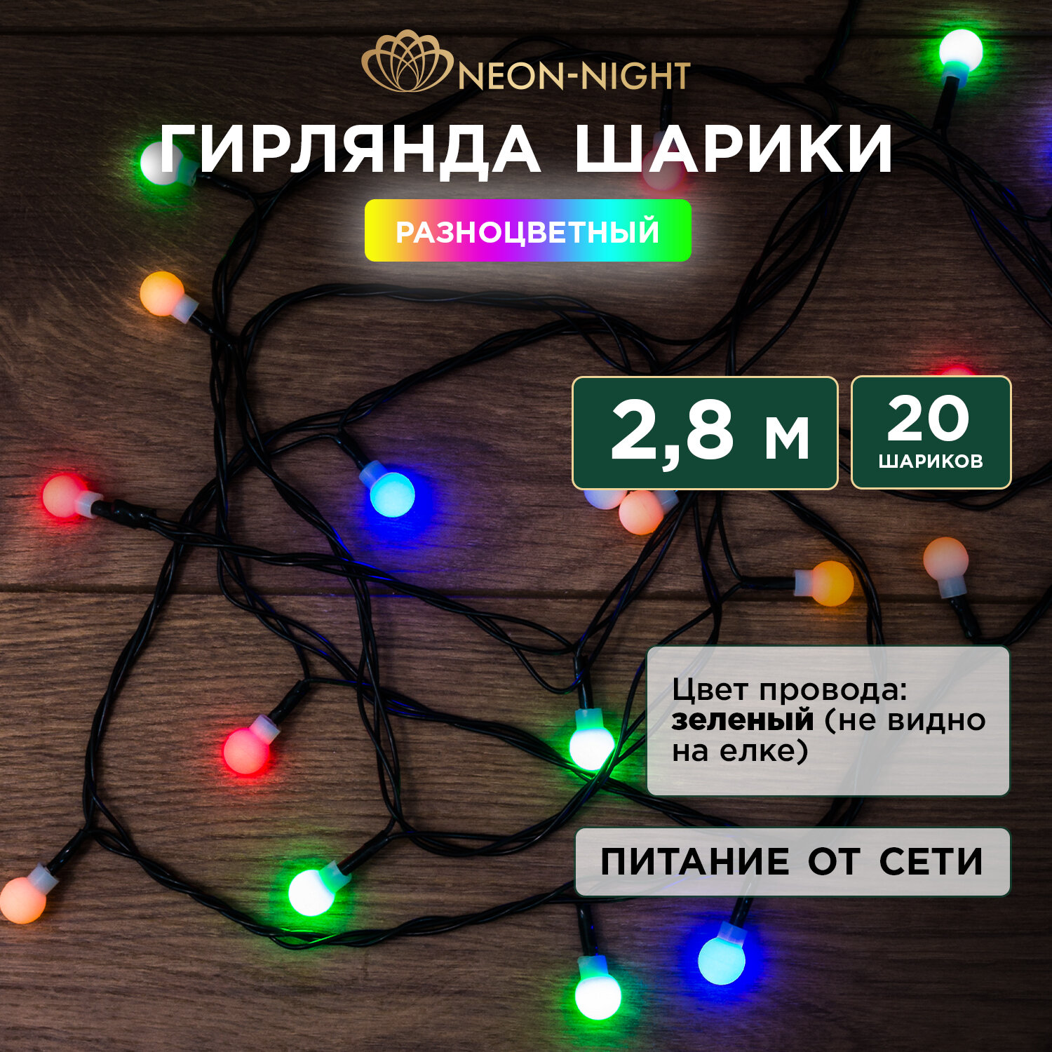 Светодиодная гирлянда NEON-NIGHT "Цветные шарики" 2.8 м, 8 режимов, 20 разноцветных шариков, тёмно-зелёный провод