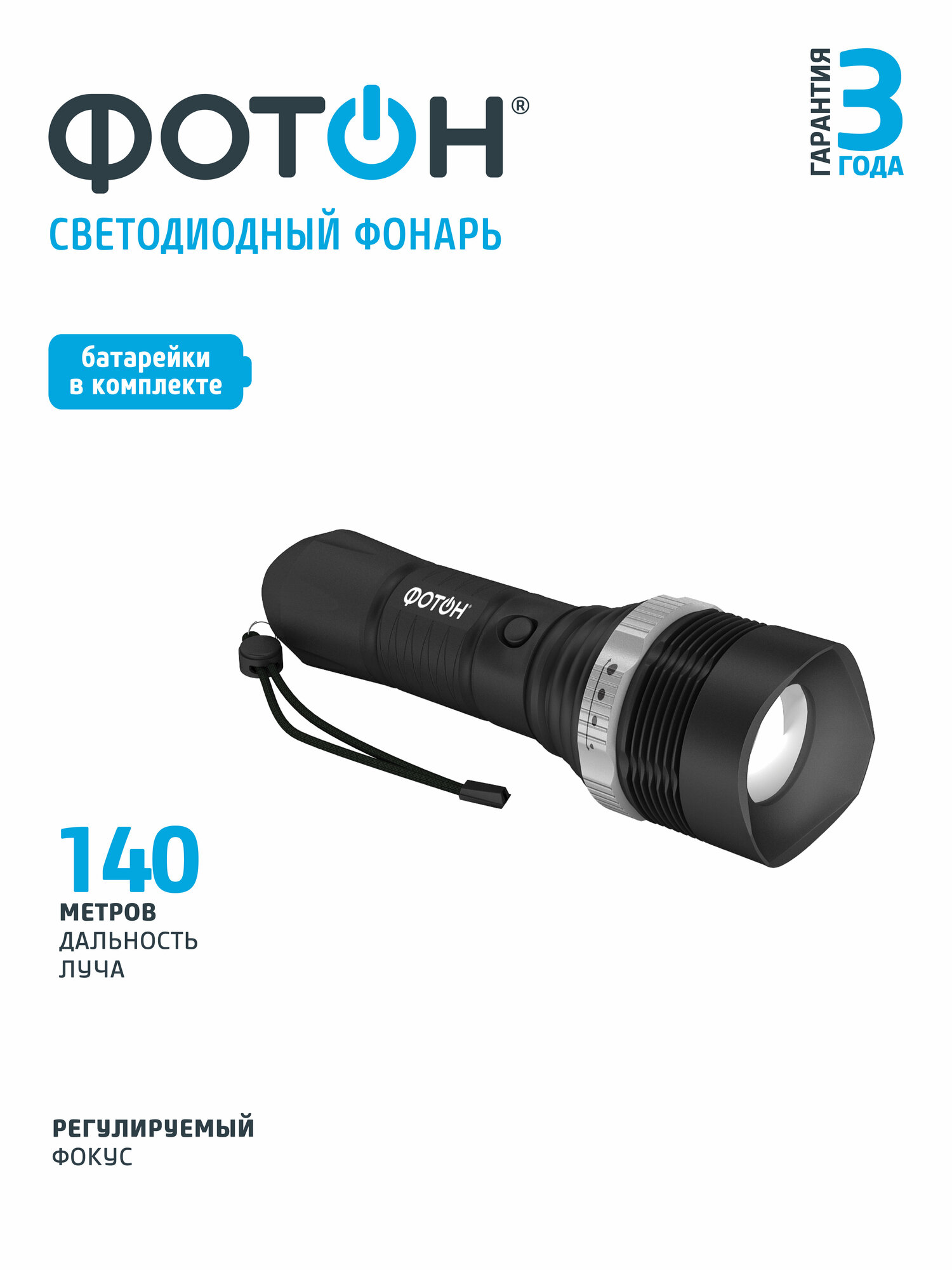 Фонарь (LED* 1) резинопласт. черн. (2хLR06 в компл.) регул.фокус фотон