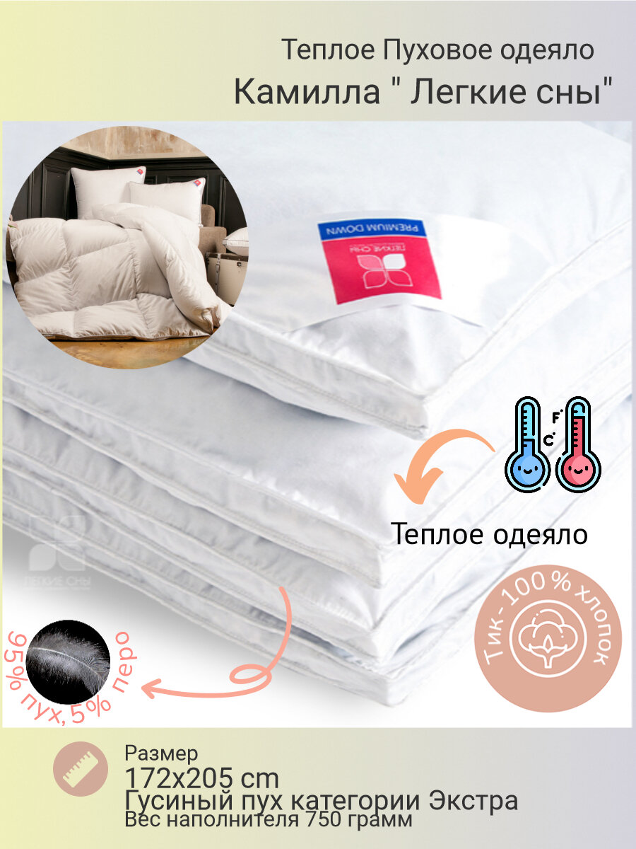Теплое пуховое одеяло 172х205 / натуральный пух экстра / Ткань: Тик / Камилла / Легкие Сны /1ед.