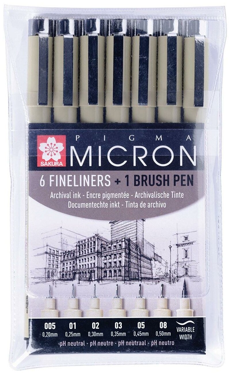 Набор ручек капиллярных 7 штук (линеры 0.2, 0.25, 0.3, 0.35, 0.45, 0.5; кисть Brush), Sakura Pigma Micron (пигментные светостойкие чернила)