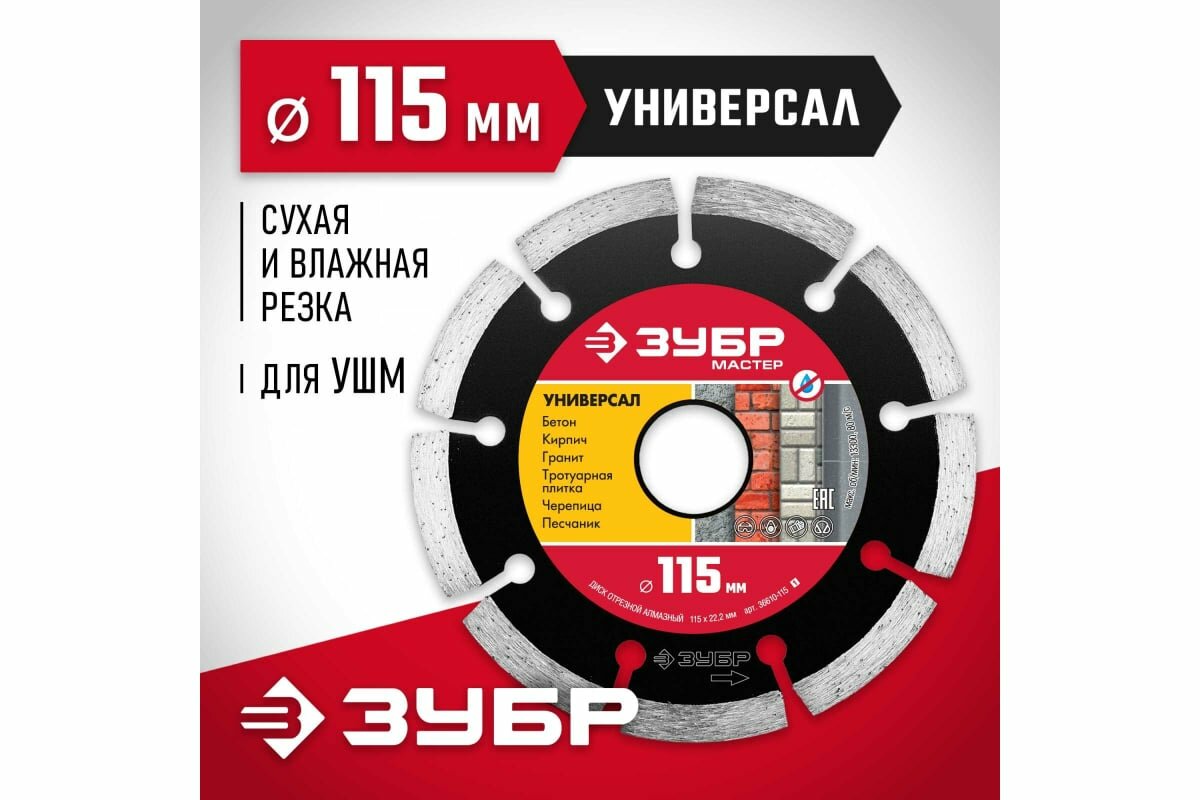 ЗУБР универсал 115 мм, диск алмазный отрезной сегментный, бетон, кирпич, гранит, камень, плитка, черепица (115х22.2 мм, 7х1.9 мм), (36610-115_z01)