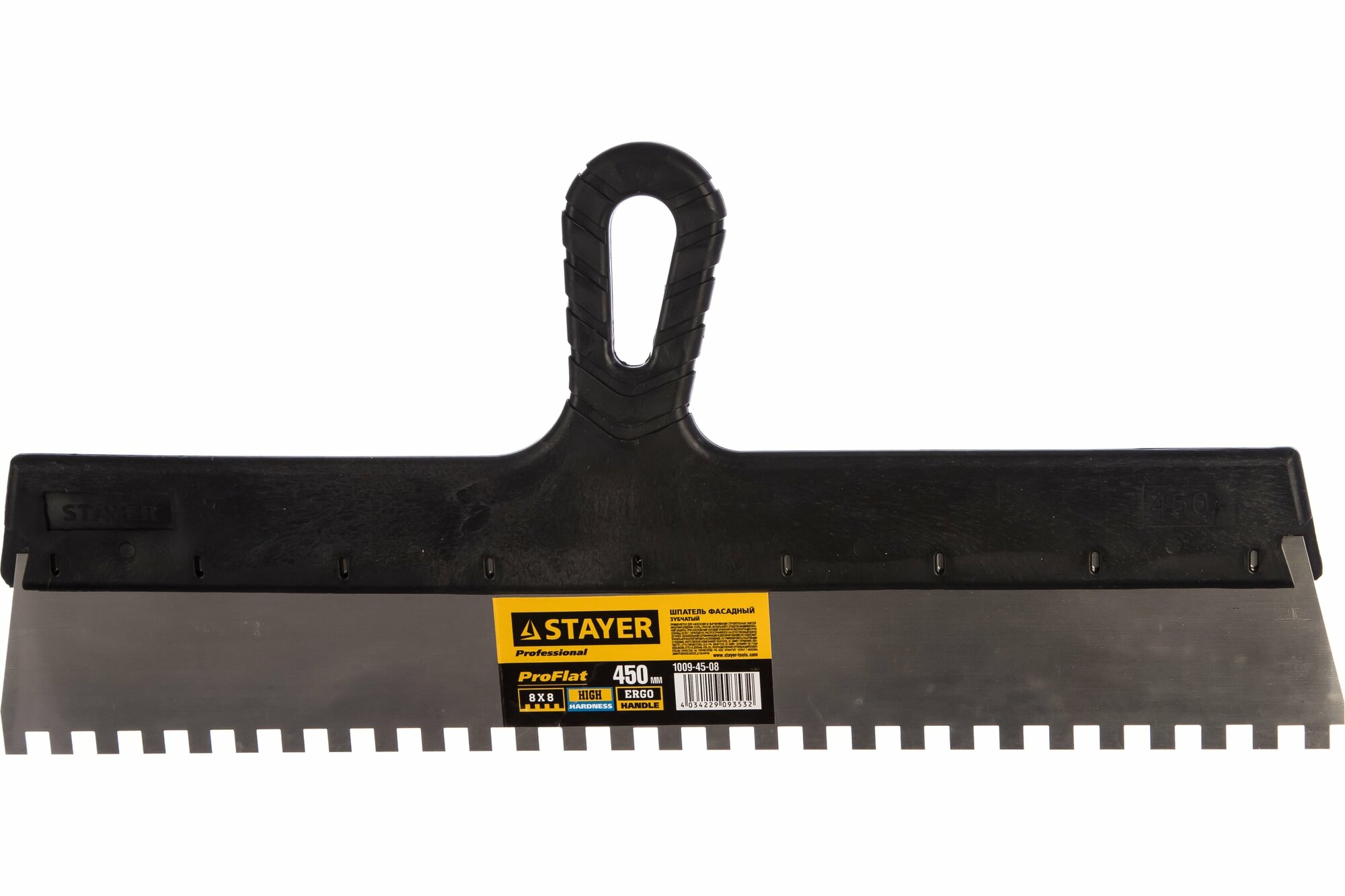 Купить STAYER ProFLat 450 мм, зуб 8х8 мм, пластиковая ручка, зубчатый, нержавеющий, Фасадный шпатель, PROFESSIONAL (1009-45-08)