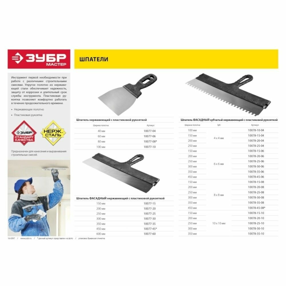 Ниже Вы можете прочитать отзывы на ЗУБР 150 мм, зуб 4х4мм, зубчатый пластиковая ручка, нержавеющий, Фасадный шпатель, мастер (10078-15-04), ознакомится с подробными характеристиками, посмотреть интересные обзоры и фотографии на ЗУБР 150 мм, зуб 4х4мм, зубчатый пластиковая ручка, нержавеющий, Фасадный шпатель, мастер (10078-15-04).