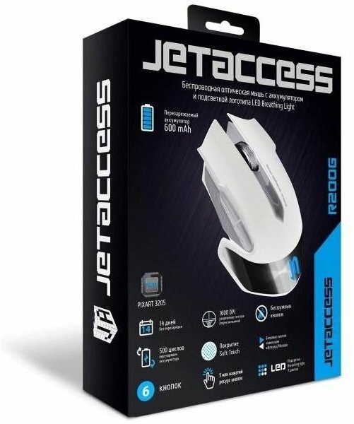 Беспроводная аккумуляторная мышь с бесшумными клавишами Jetaccess R200G белая (1000/1200/1600dpi, сенсор Pixart 3205, 6 кнопок (включая колесо прокрутки), LED-подсветка LOGO, кабель зарядки 50см в комплекте, USB)