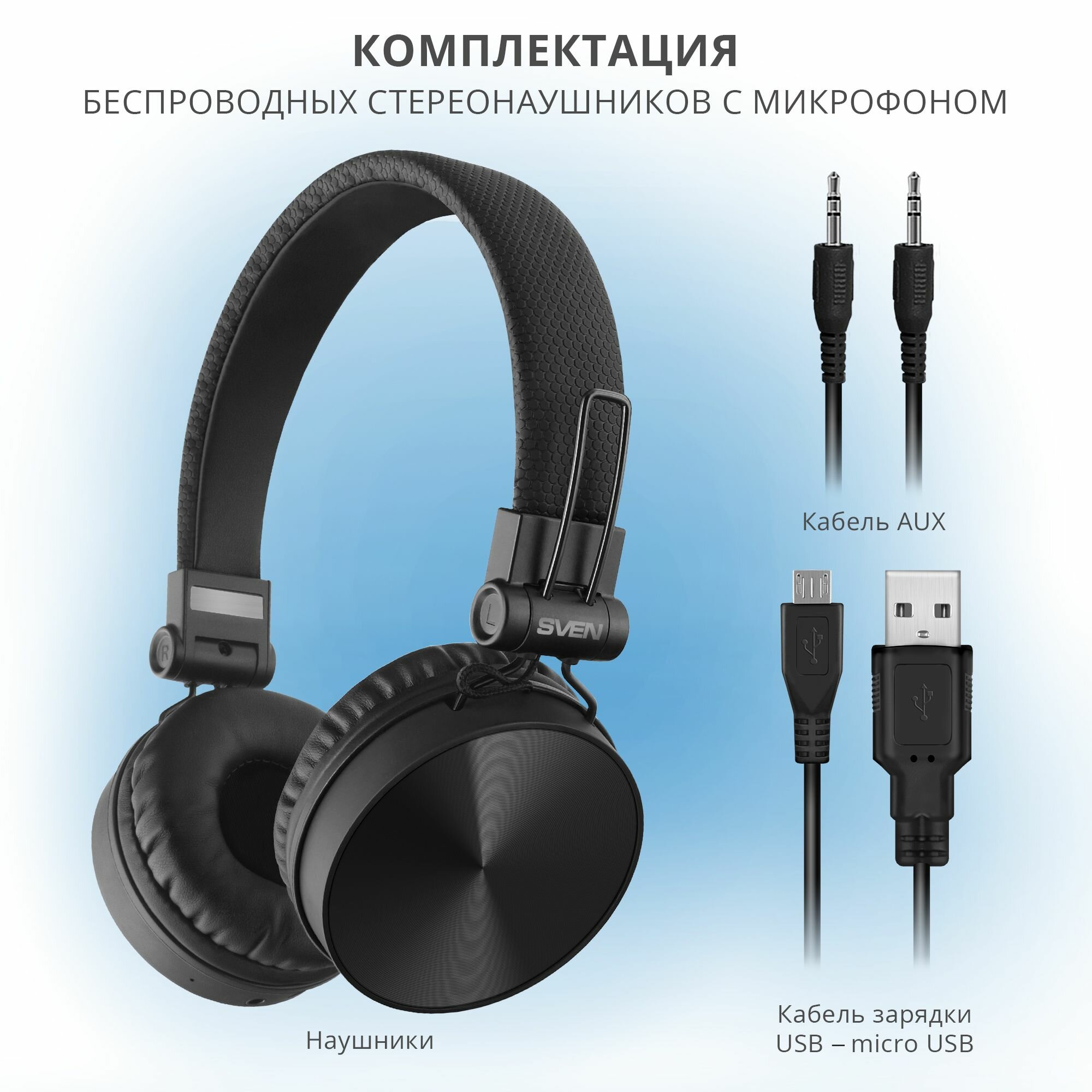 Наушники с микрофоном беспроводные Sven AP-B500MV, Bluetooth, складные, разъем Micro-USB, черный