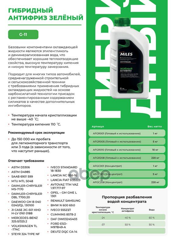 Ниже Вы можете прочитать отзывы на Антифриз G11 Miles Готовый 1Кг (Зеленый) Miles арт. AFGR001, ознакомится с подробными характеристиками, посмотреть интересные обзоры и фотографии на Антифриз G11 Miles Готовый 1Кг (Зеленый) Miles арт. AFGR001.