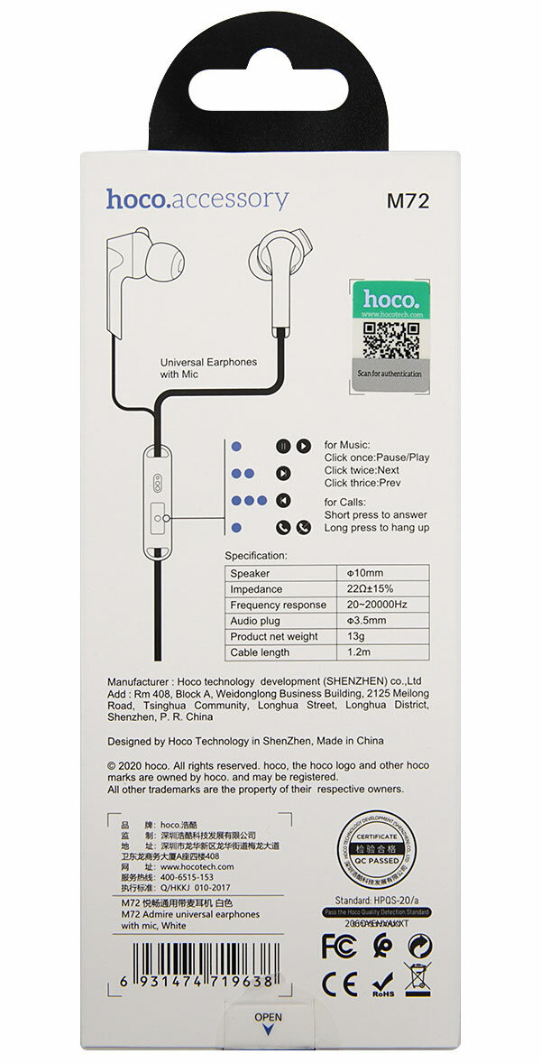 Проводные наушники, внутриканальные, Hoco M72 Admire, 3.5 Jack, белые