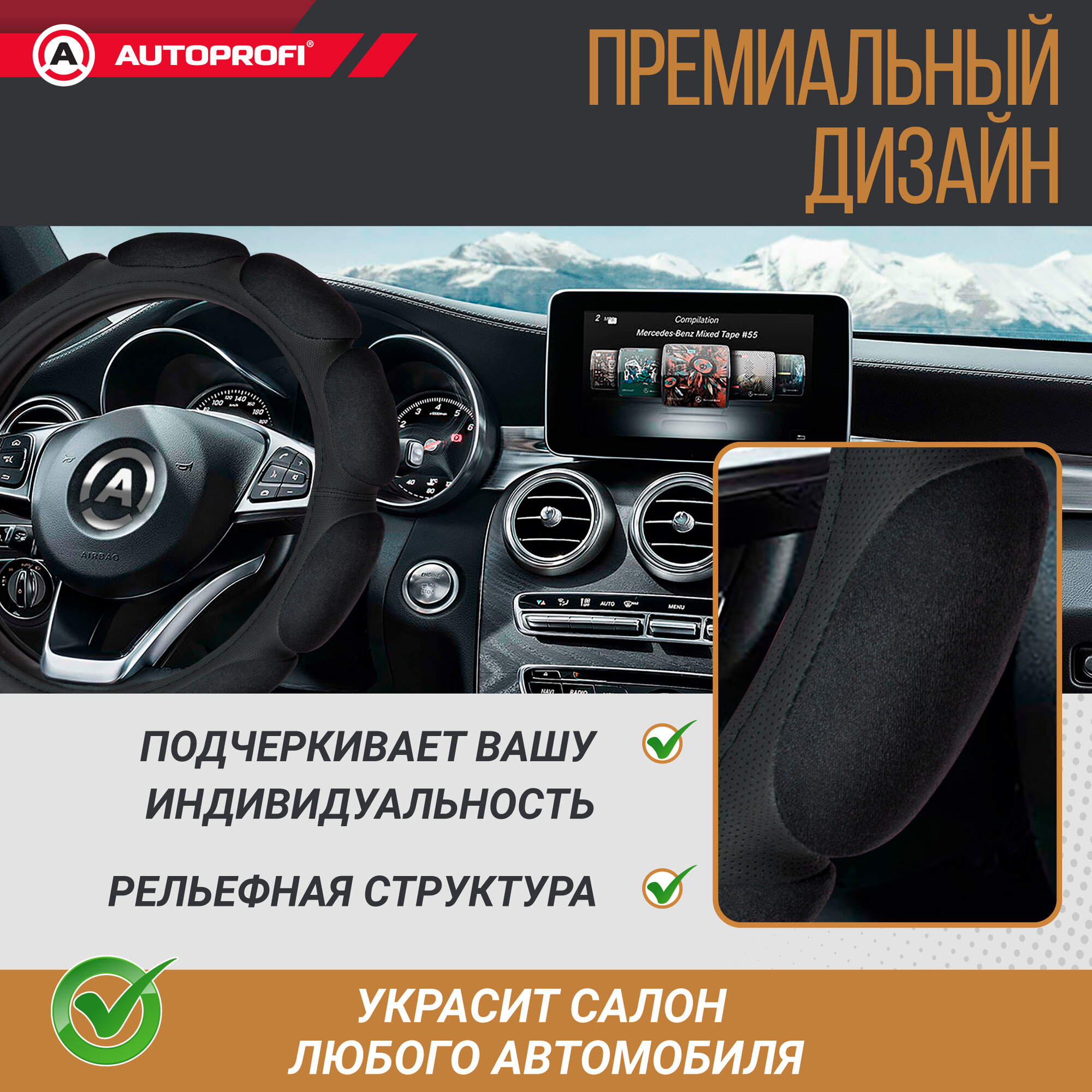 Оплетка на руль AUTOPROFI, кожа с 10 подушечками из алькантары, черный цвет, размер M (37-39см)