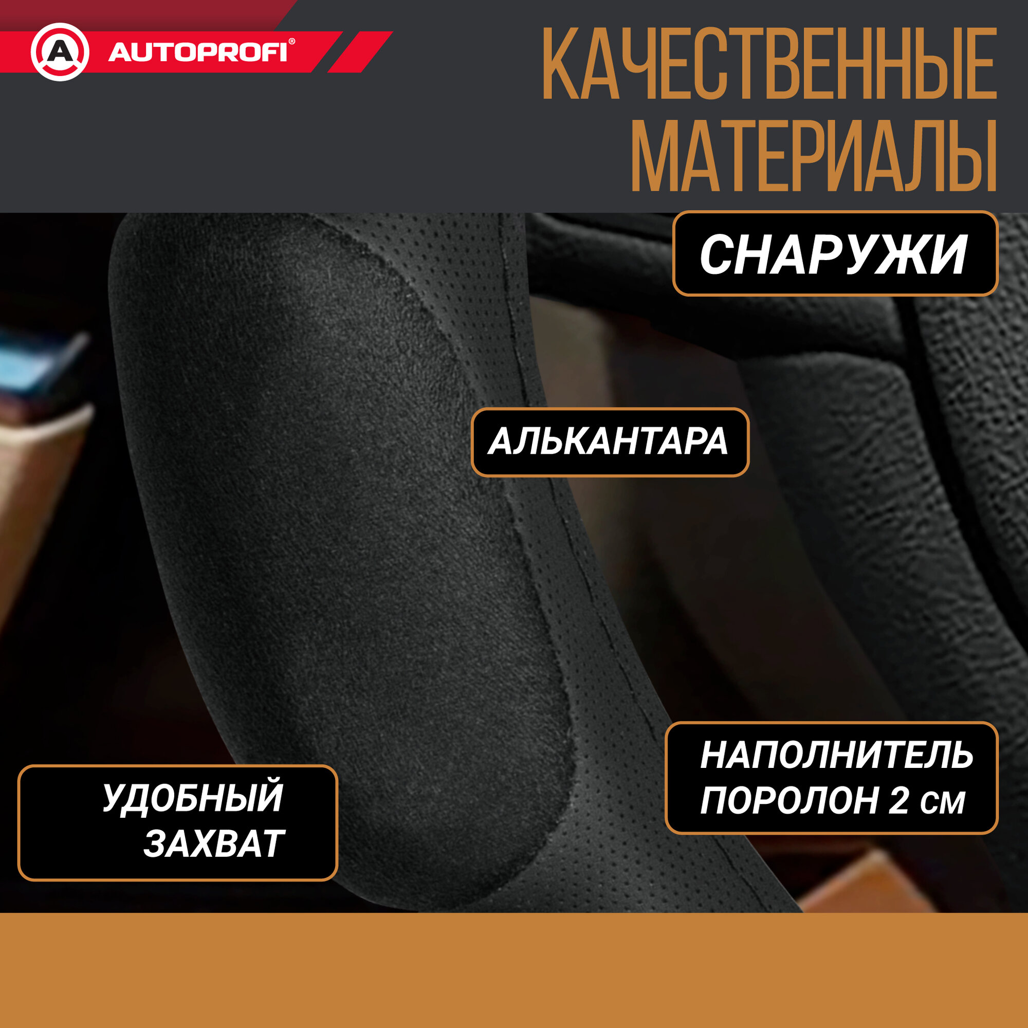 Оплетка на руль AUTOPROFI M 38см алькантара 10 подушек 2 см поролон с памятью, черная
