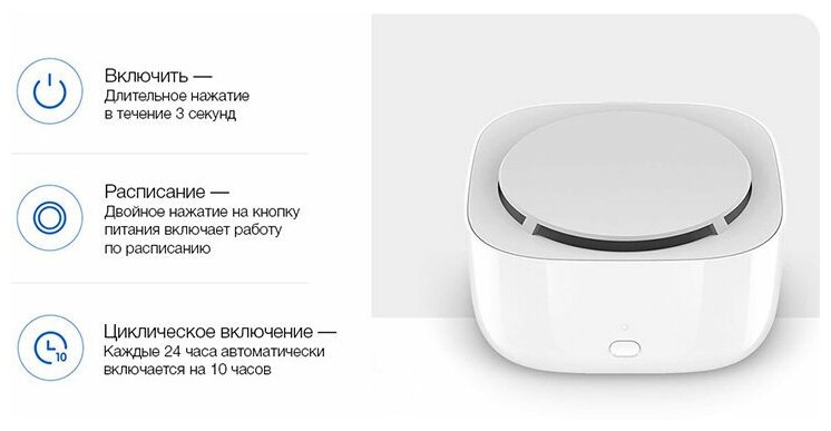 | Плюсы: | Работает очень тихо,подключается к mihome регион Китай сразу,есть включение/выключение по времени,в комплекте 2 батарейки АА и кабель type-c |