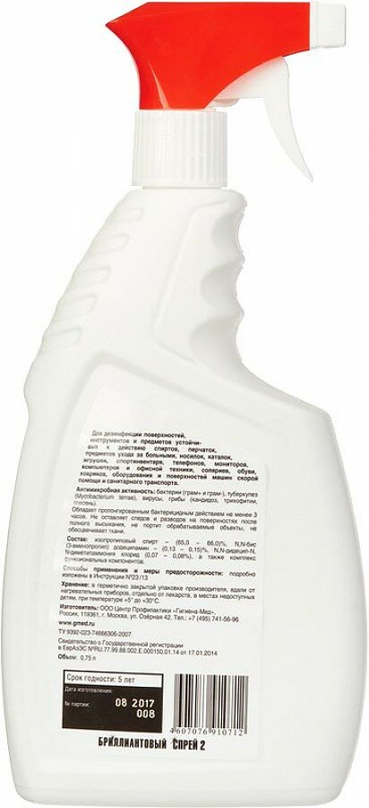 Гигиена Мед Средство дезинфицирующее для поверхностей и оборудования Бриллиантовый спрей 2, 750 мл