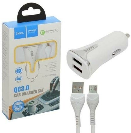 Купить Автомобильное зарядное устройство 2USB 2.4A QC3.0 быстрая зарядка с кабелем micro USB HOCO Z31 White