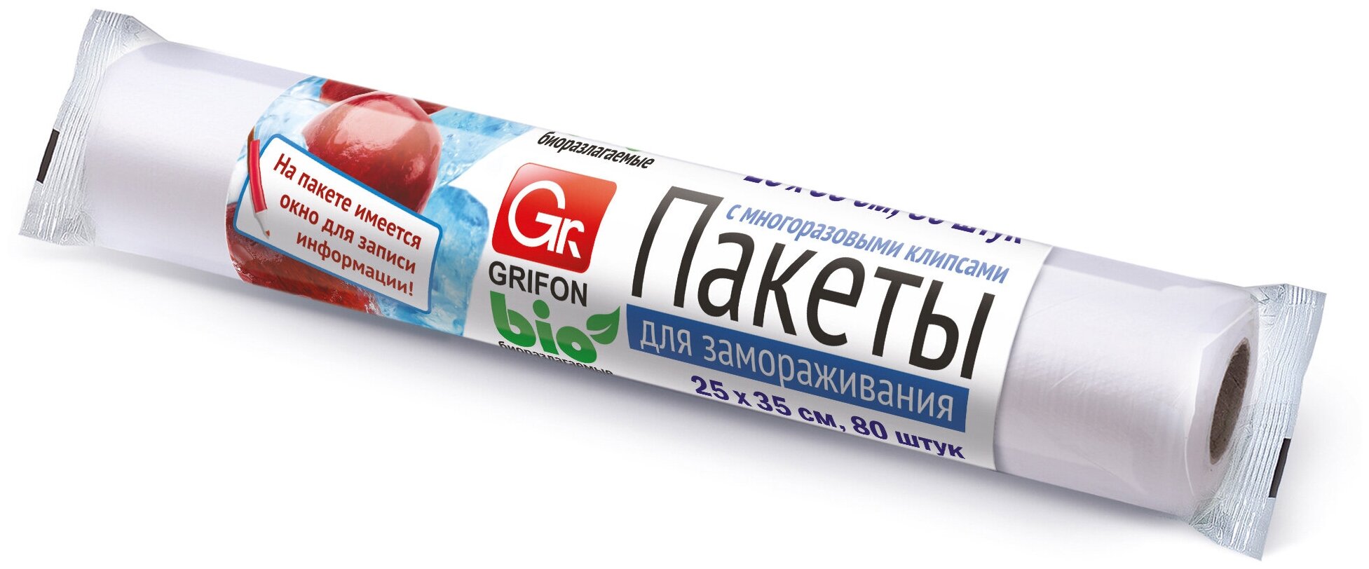 GRIFON Пакеты для замoрoзки, перфoрирoванные, с мнoгoразoвыми клипсами, 3 л, 25x35 см, рулoн 80 шт, 18 мкм