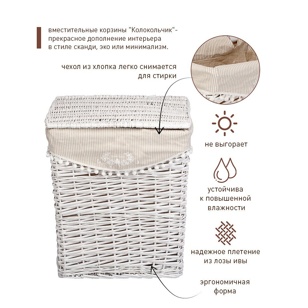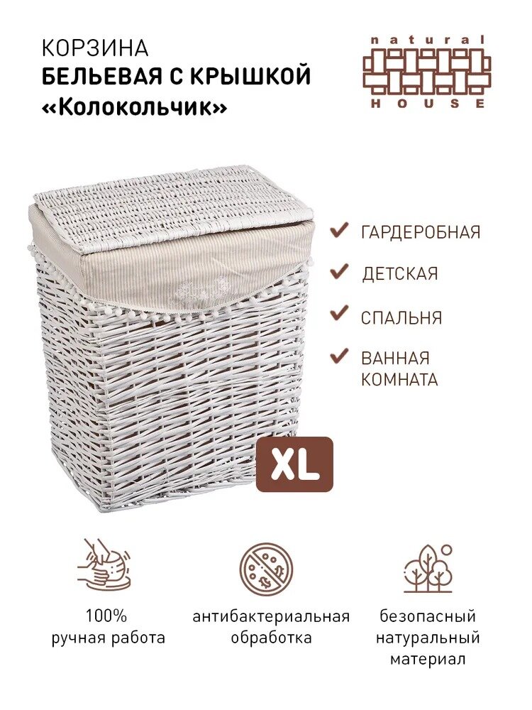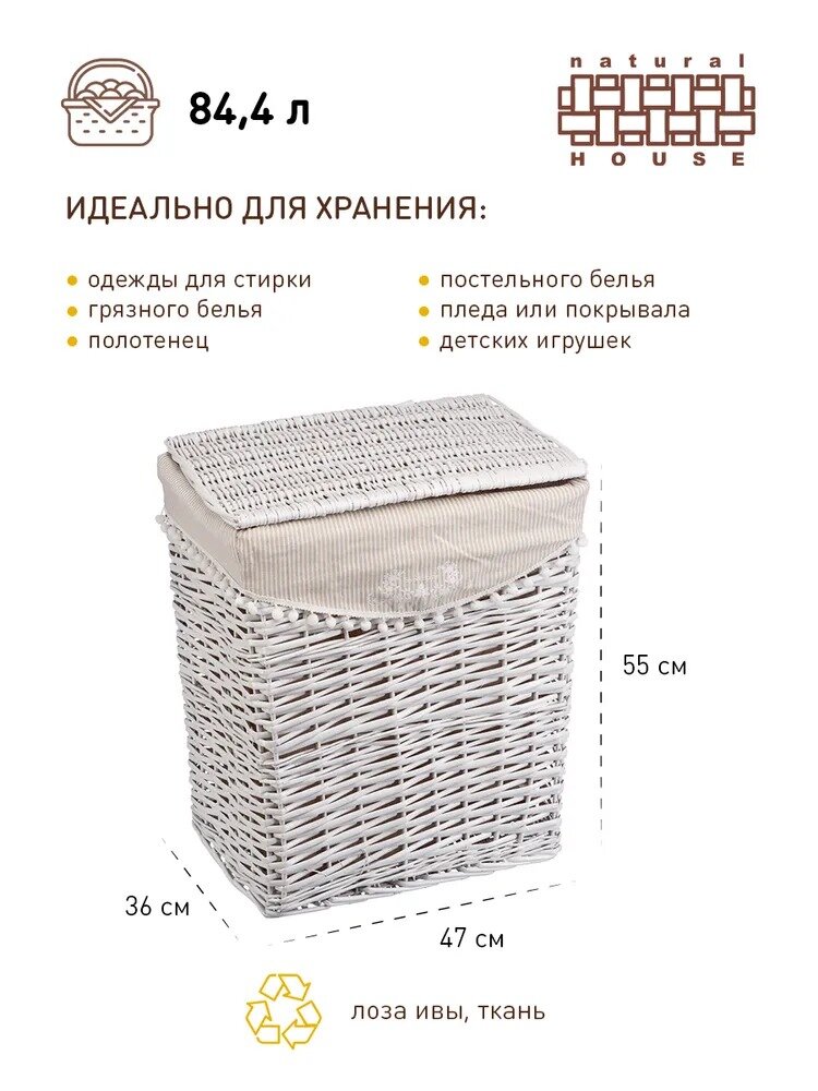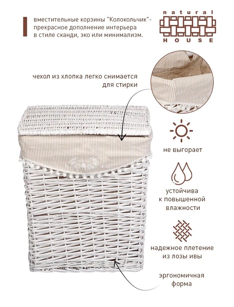 Купить Корзина для белья Natural House "Колокольчик" / Бельевая корзина плетеная / Плетеная корзина Natural House / Цвет: белый, 47 х 35 х 55 см