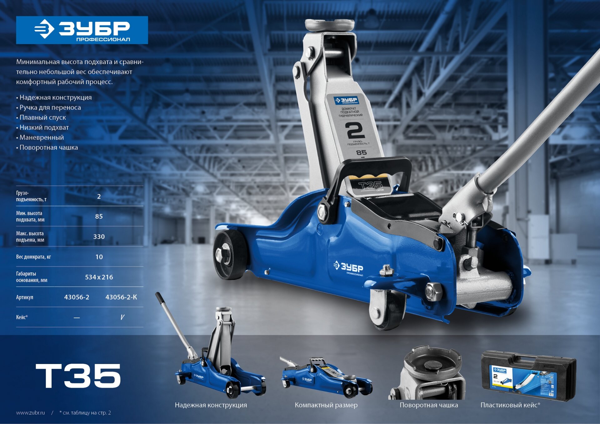 ЗУБР Т-35 2т 85-330мм подкатной домкрат с низким подхватом, Профессионал, 43056-2