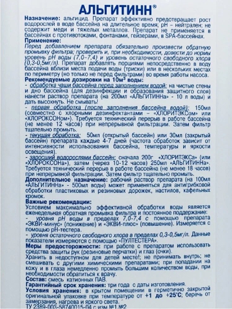 Жидкое средство для обработки плавательных бассейнов альгитинн (предотвращает рост водорослей), 1л.