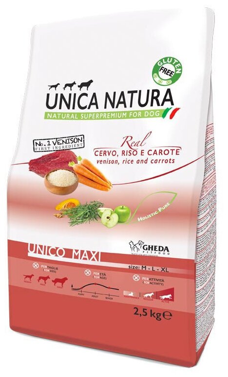 Сухой корм для собак Unica Natura оленина, с рисом, с морковью 2.5 кг (для средних и крупных пород) интересное: