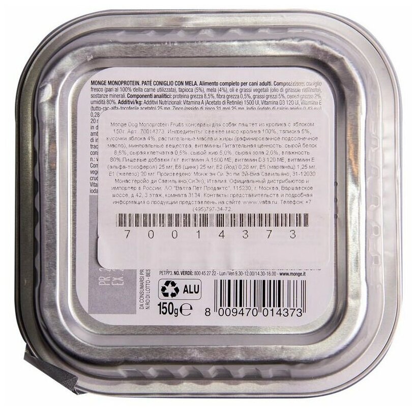 Ниже Вы можете прочитать отзывы на Влажный корм для собак Monge Dog Monoprotein CONIGLIO con MELA, беззерновой, кролик, с яблоком, 24 шт. х 150 г, ознакомится с подробными характеристиками, посмотреть интересные обзоры и фотографии на Влажный корм для собак Monge Dog Monoprotein CONIGLIO con MELA, беззерновой, кролик, с яблоком, 24 шт. х 150 г.