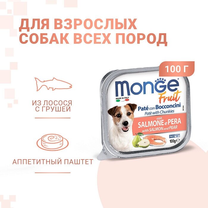 Влажный корм для собак Monge Fruit Dog PATE & BOCCONCINI con SALMONE e PERA, лосось с грушей, 100 г
