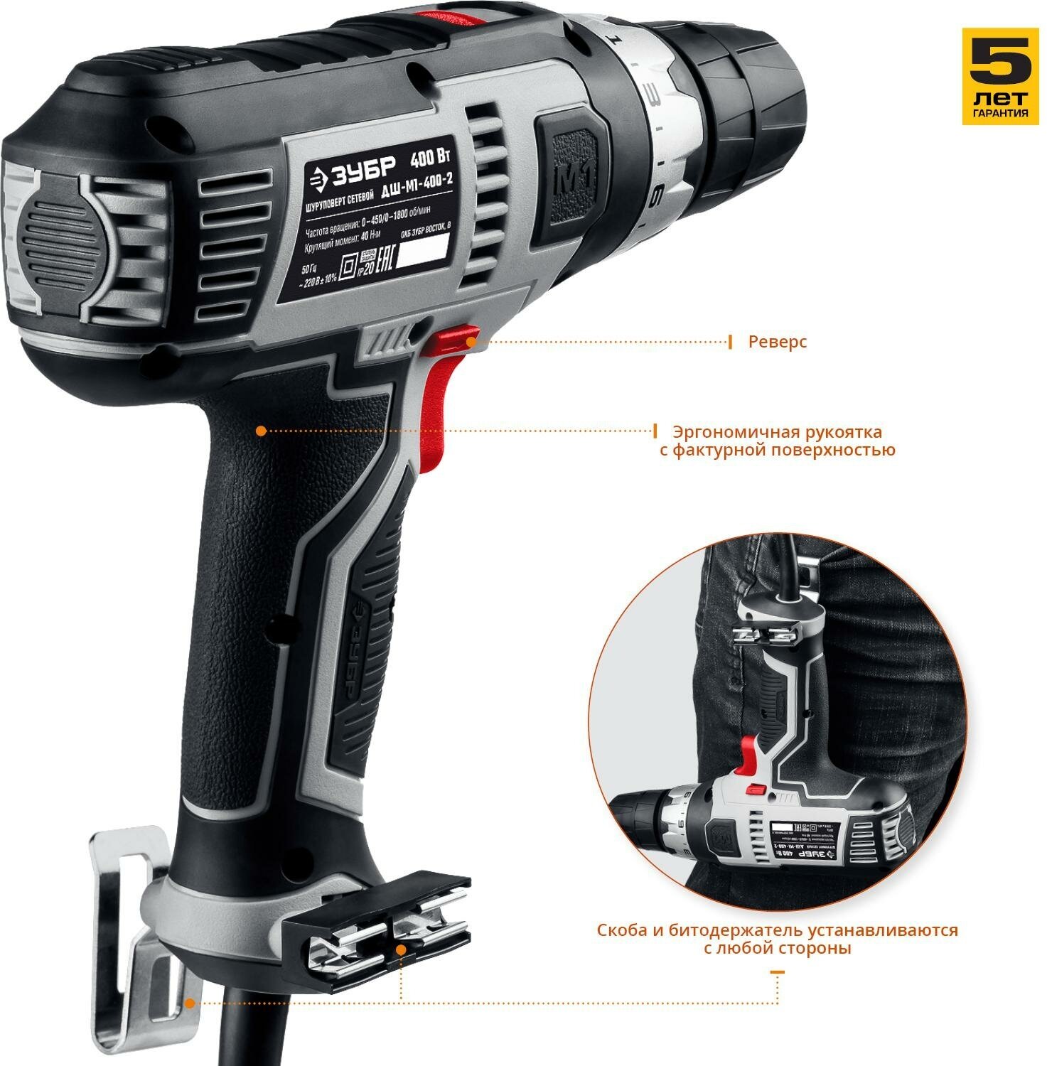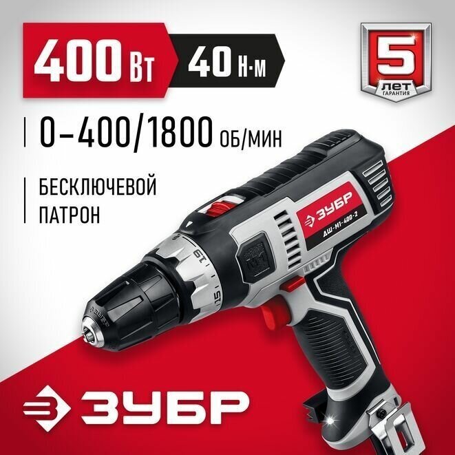 ЗУБР 400 Вт, 40 Н·м, сетевая дрель-шуруповерт (ДШ-М1-400-2)